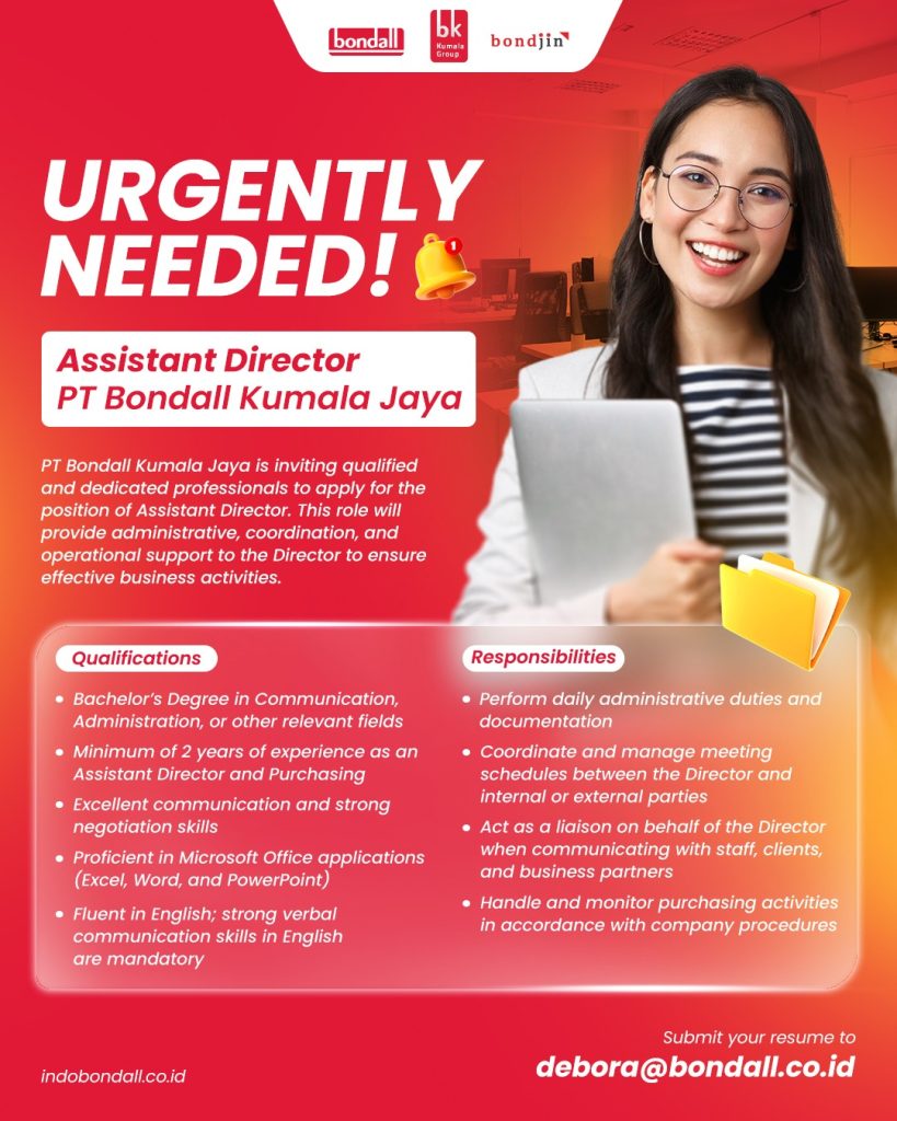 PT Bondall Kumala Jaya is inviting qualified and dedicated professionals to apply for the position of Assistant Director. This role will provide administrative, coordination, and operational support to the Director to ensure effective business activities.